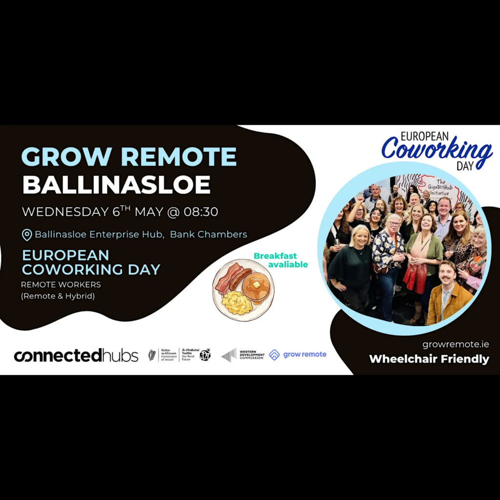 This event is part of a nationwide series hosted by Grow Remote in partnership with Connected Hubs. Coworking spaces like Ballinasloe Enterprise Hub are central to how remote work creates real, lasting benefits for towns like Ballinasloe and days like this are a chance to experience that first-hand.