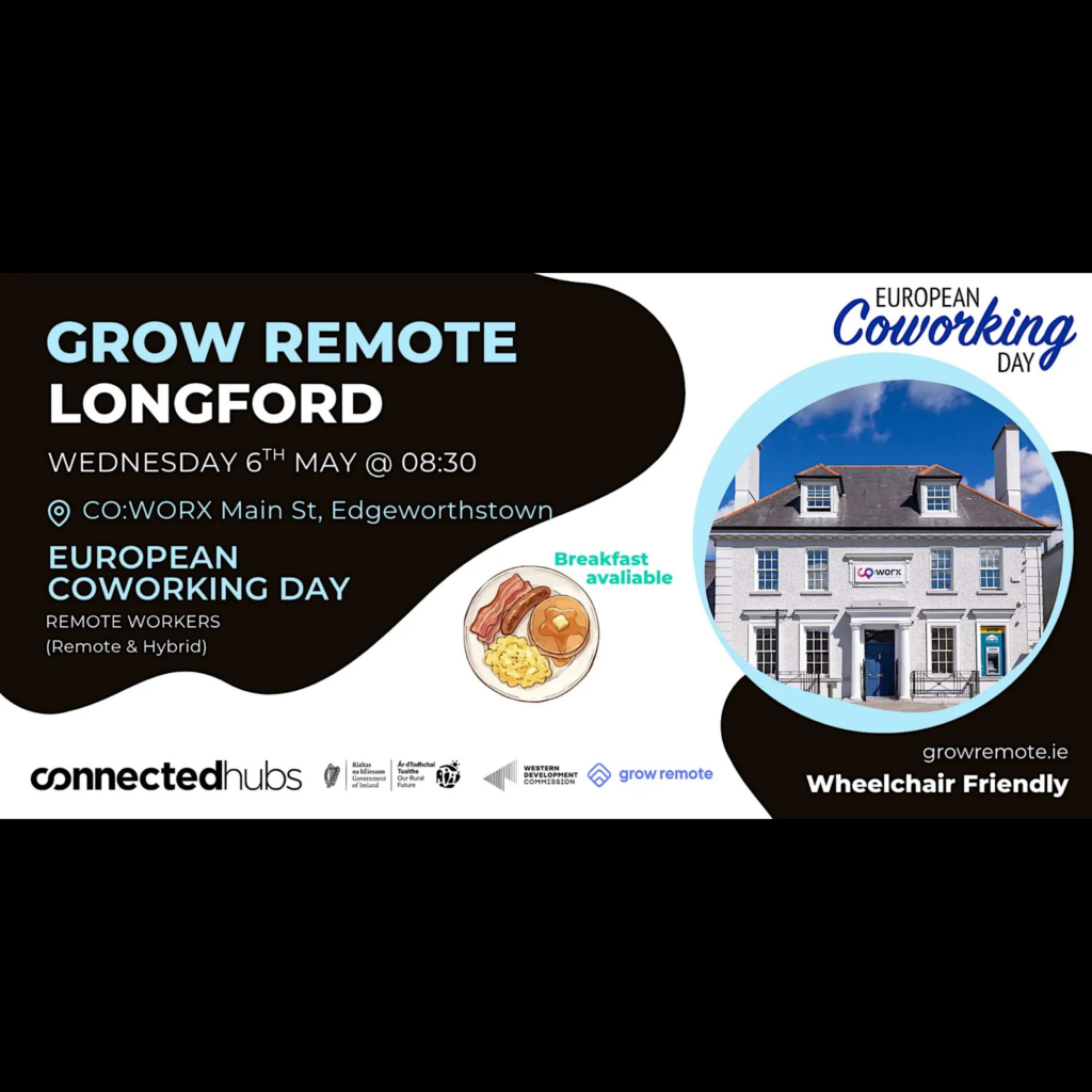 This event is part of a nationwide series hosted by Grow Remote in partnership with Connected Hubs. Coworking spaces like CO:WORX are central to how remote work creates real, lasting benefit for places like Longord and days like this are a chance to experience that first-hand.